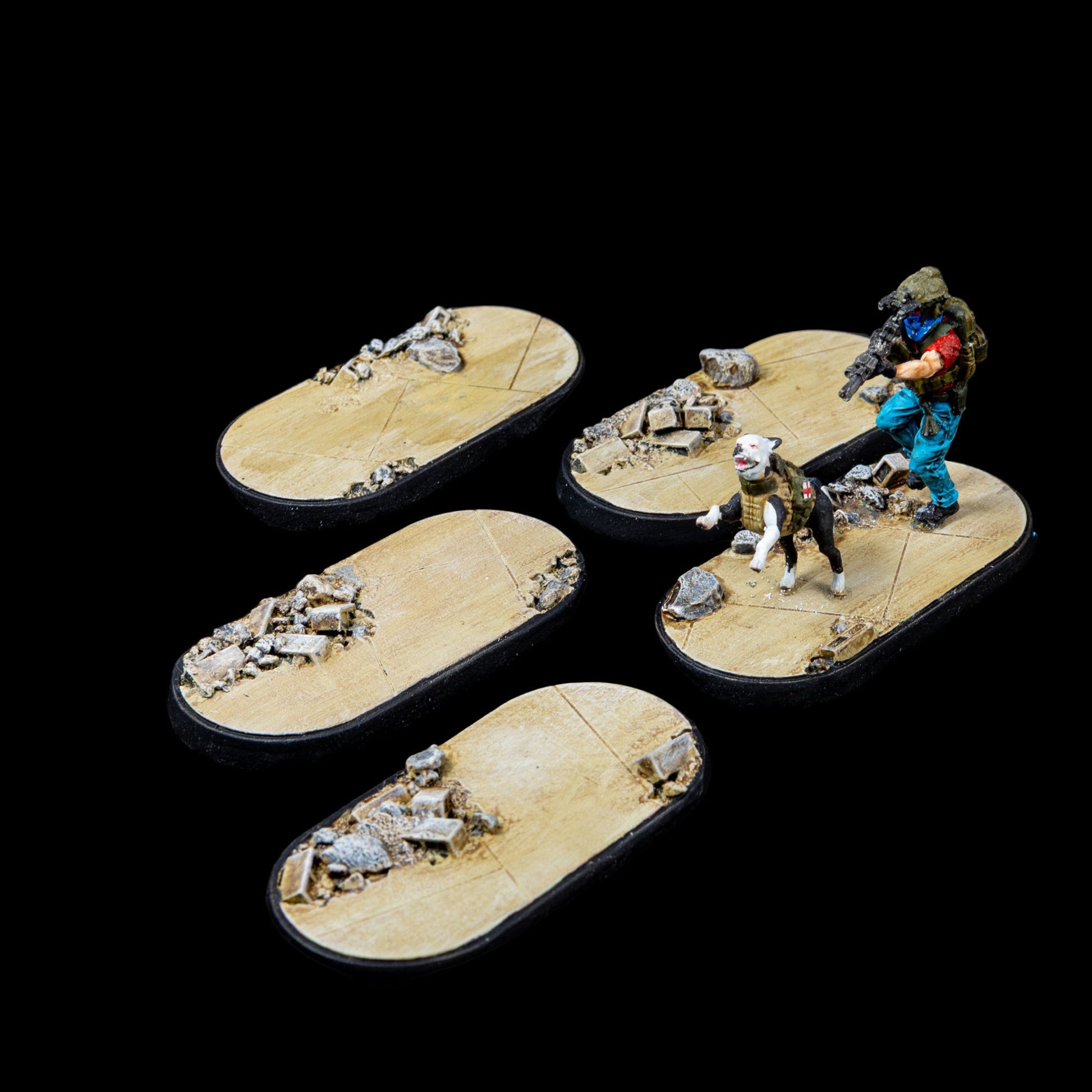30mm x 60mm tapered edge bases decorated with urban rubble. Perfect for post apocalypse and modern warfare games like Spectre Operations, In Country, Force On Force, and others.
