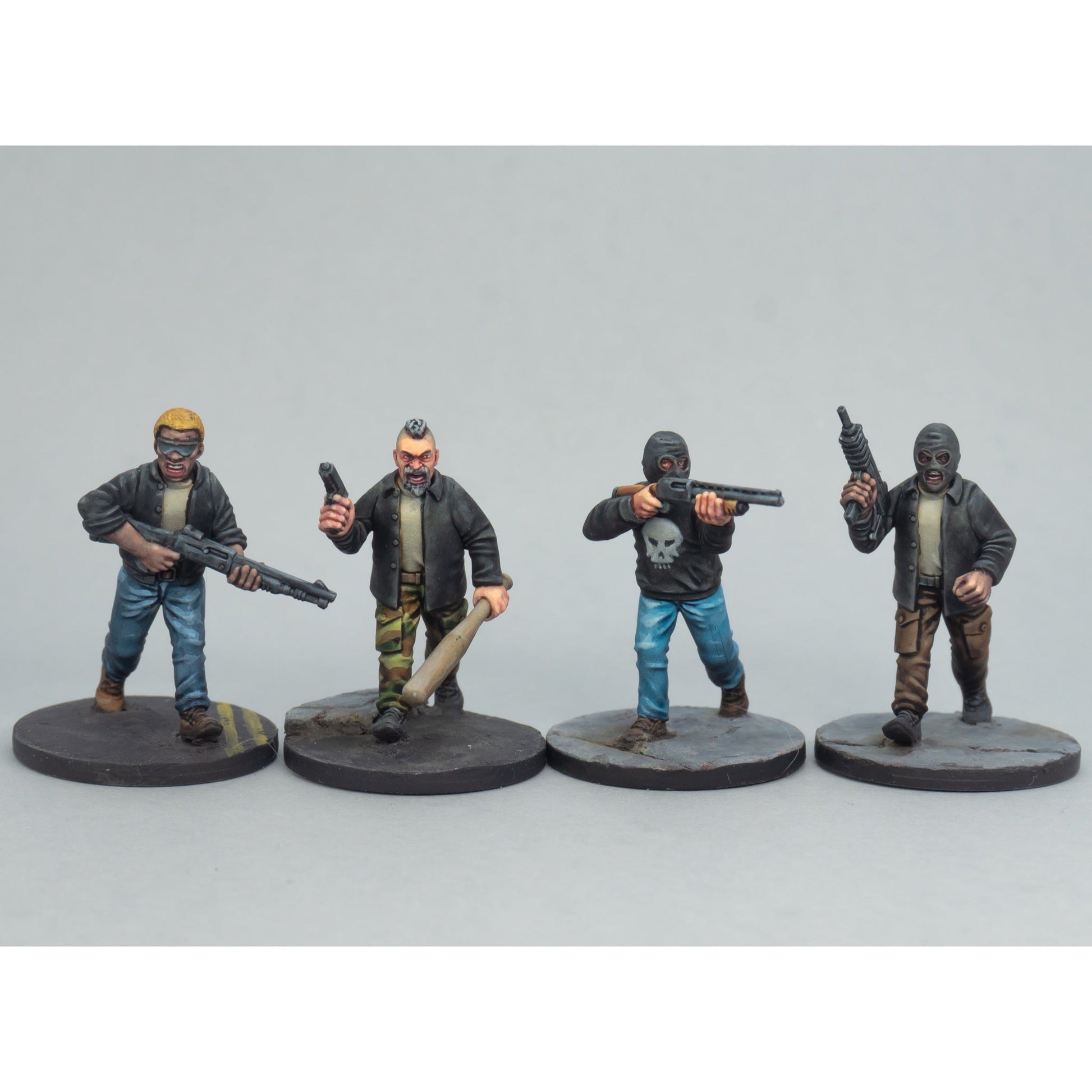 This hard plastic box set includes enough parts to build 24 28mm figures. There are six unique bodies, enough arms to make all of them fleeing, enough arms to have 1/2 the box holding signs, and a huge mix of weapon arms. Weapon arms include: broken bottles, baseball bats, cricket bats, machetes, double barreled shotguns, semi-auto shotguns, pump shotguns, AR-15s, automatic pistols and revolvers, Uzis, and hunting/sniper rifles. And to top it off there are 55 unique heads with a total of 220 heads in the box!